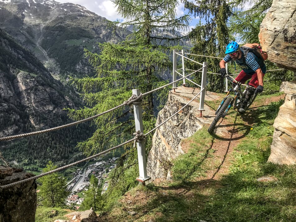 Don’t forget to admire the idyllic surroundings! The Mattsand Enduro Trail takes you past typical Valaisian barns made of sun-blackened larch wood. And the ride over babbling brooks and through green meadows is simply gorgeous!