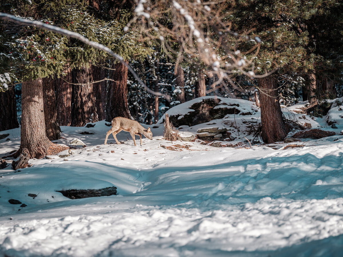 This circular tour at around 2100 metres above sea level takes you on a relatively flat route through the winter forest. It requires little effort from you as you trudge the 2.5 kilometres through the snow. On a short ascent, the clear winter air flows through your body and your muscles warm up.
