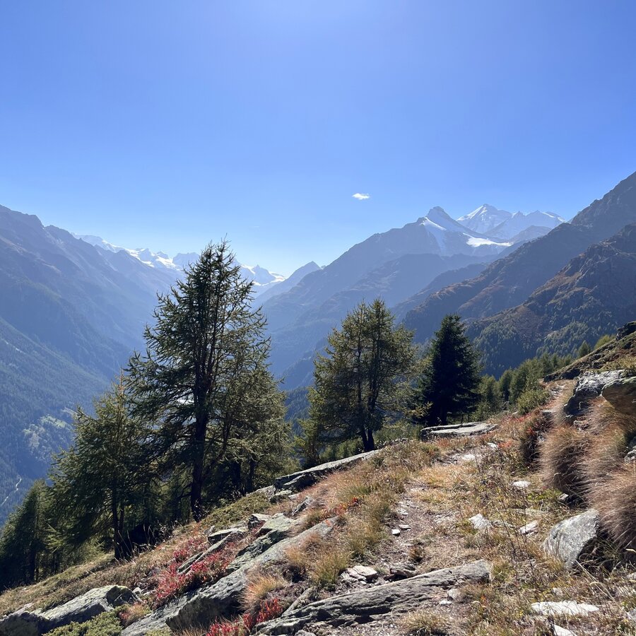 Start your panoramic circular trail from the Jungenalp and follow the path towards Moosalp. You hike about half a kilometre through the forest and along the rock face until you follow the path uphill on the left. The higher you go, the stonier it gets and the vegetation becomes sparser. You will reach the highest point of your tour at about 2360 m above sea level. From there, the path leads you meanderingly downhill back to the Jungenalp.