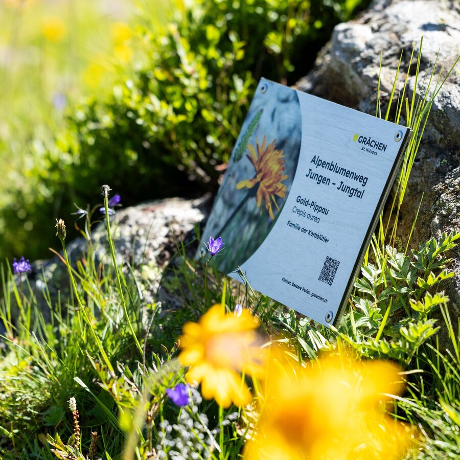 From the top station of the St. Niklaus - Jungen cable car, high above the Mattertal, your path leads you past the lake. On the left, follow the trail uphill through the larch forest in the direction of Jungental. It is not long before you reach the edge of the forest and follow the signposted path along the "flower panels". Your gaze wanders through the beautiful nature and you pause at the information boards. Despite the ascent to 2350 metres above sea level, you don't notice how time flies. Enjoy the fantastic mountain scenery with views of the high peaks and, of course, the flora.