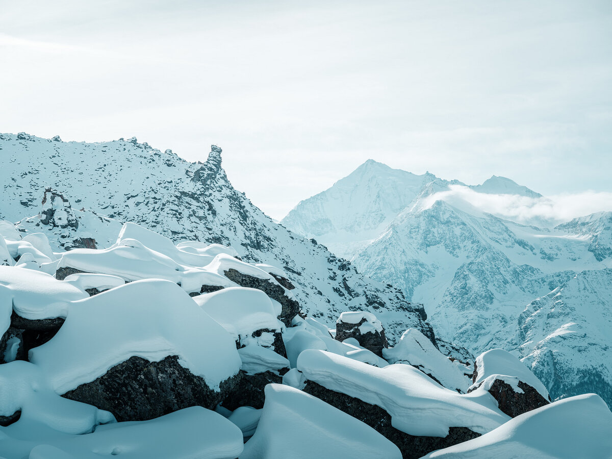 Once you’ve arrived at the Hannigalpbahn mountain station, you can admire the snow-covered mountains for a moment and then set off in the direction of Wannihorn. You’ll hike steadily uphill through snow-covered forests. The effort is well worthwhile, because the fantastic scenic views are truly a sight to behold: The Valais mountains show themselves from their most impressive side here.