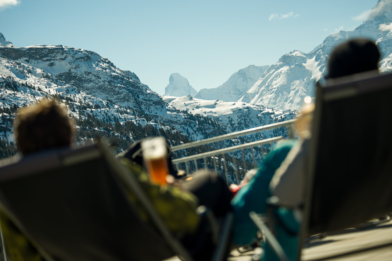Cool vibes right on Hannigalp: At the cosy Schnööbar, you can round off a successful day of winter sports with some après-ski. Enjoy fancy drinks and bop to the cool tunes coming from the sound system.